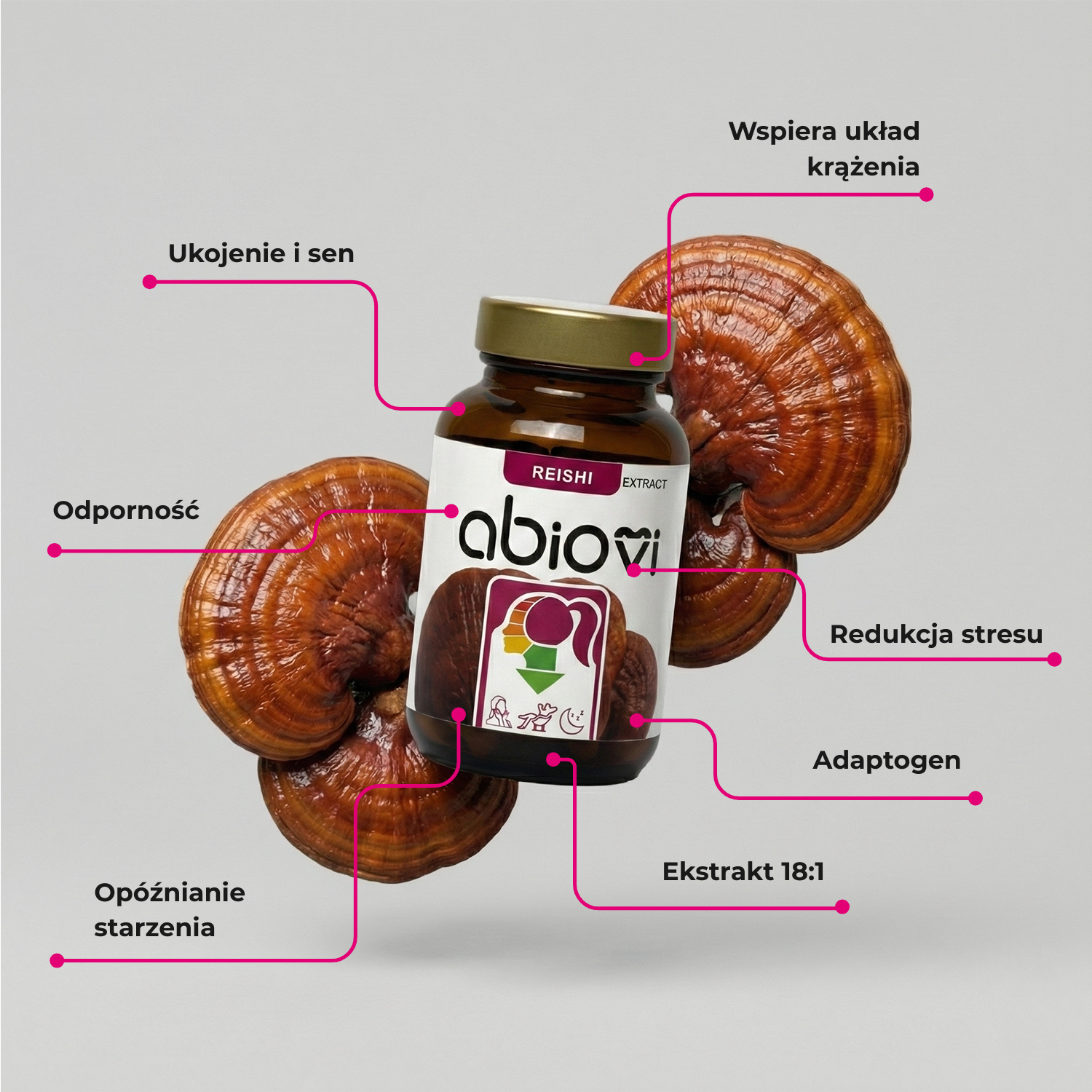 Reishi: Adaptogen, obniża stres, poprawia jakość snu, wzmacnia odporność, wspiera wątrobę i serce, redukuje stany zapalne, antyoksydant.