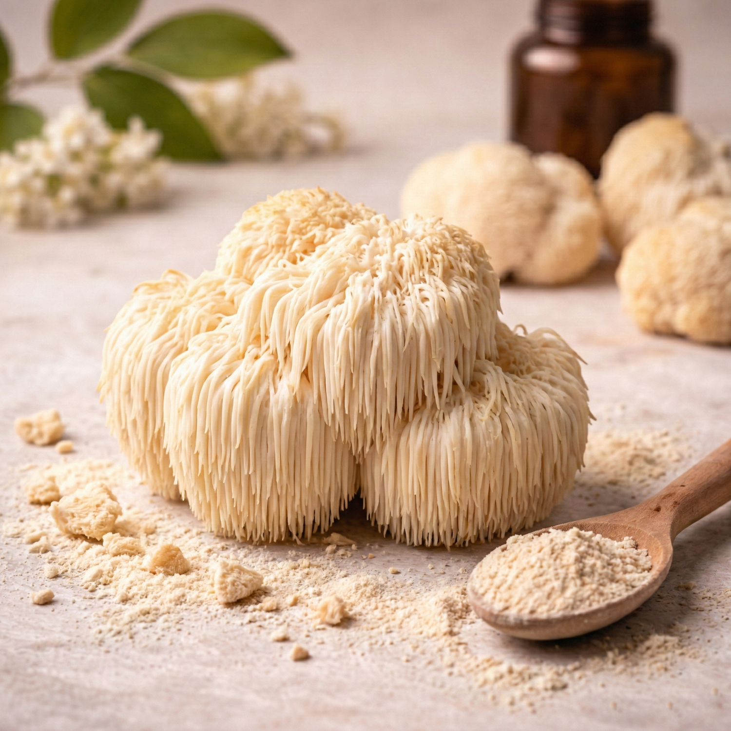 Soplówka Jeżowata (Lion’s Mane): Wspiera pamięć, koncentrację, funkcje poznawcze i układ nerwowy, sprzyja regeneracji nerwów i poprawie samopoczucia.